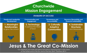The Mission Strategic Direction is visually captured in the image below, which reimagines our strategic priorities not as standalone initiatives, but as walls built upon the solid foundation of Jesus and the Great Co-Mission (Matthew 28:19). Rather than seeing Christ as an umbrella above our work, this image reflects the theological truth that all mission is built on Jesus — the rock, the source, and the sustainer (Matthew 7:24). The four strategic initiatives stand as pillars that are supported and held together by key enablers of success: leadership, communication, governance, and stewardship. Above these, the green roof of “Churchwide Mission Engagement” symbolises our collective response — grounded in faith, equipped by the Spirit, and growing outward into the world.